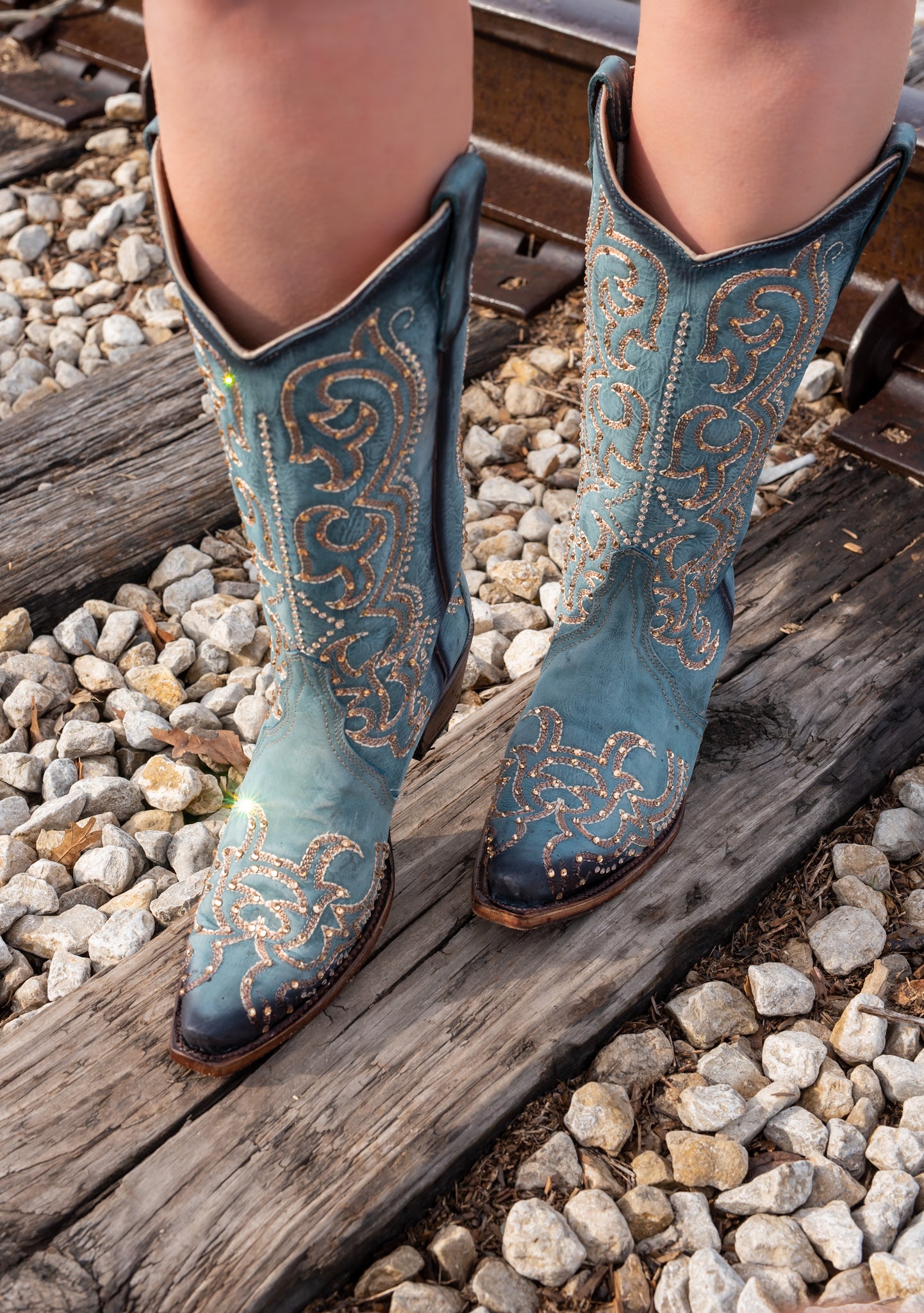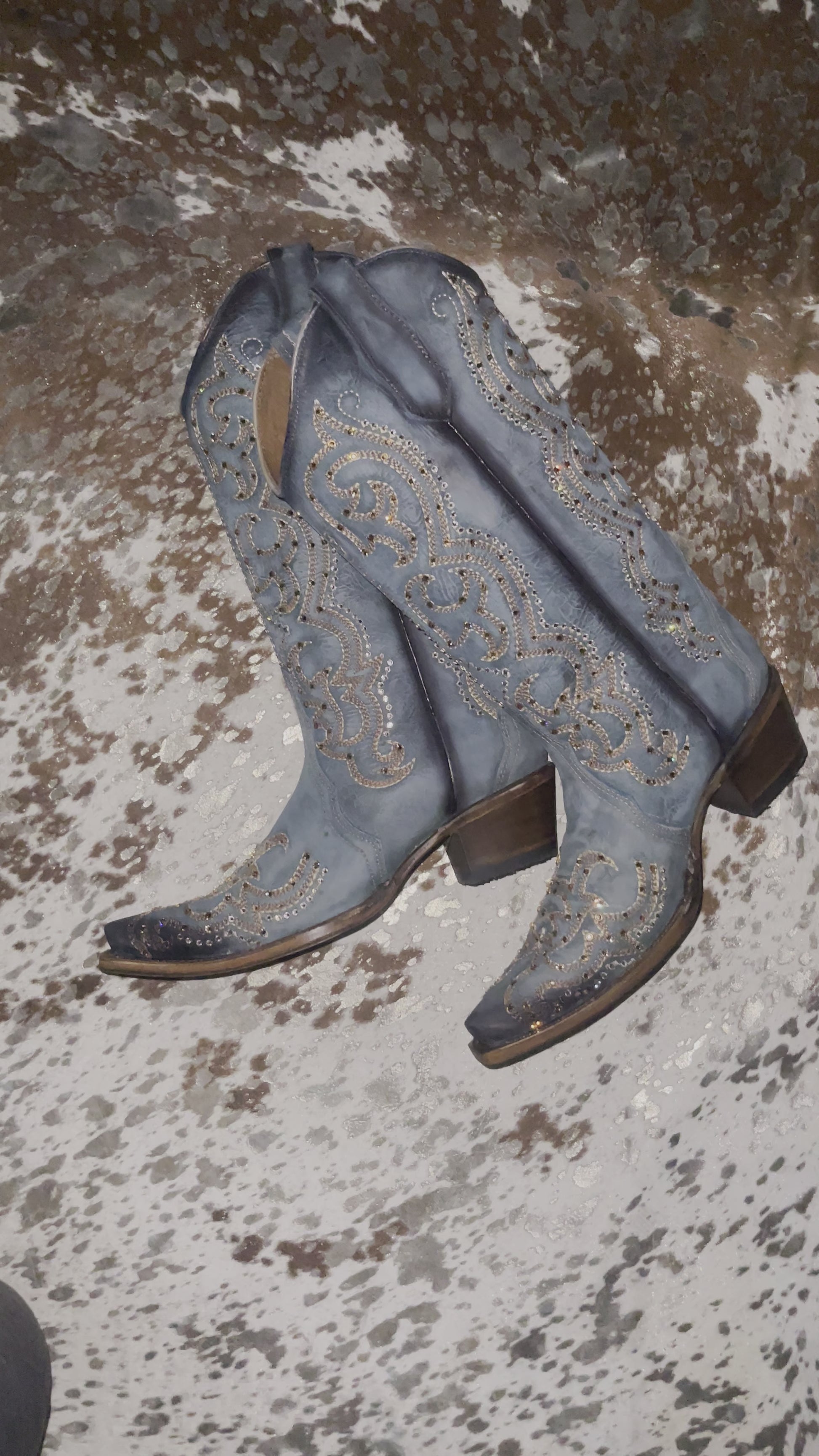 The perfect denim boot and it doesn't get better than this for the price and the sparkle! The subtle denim color is perfect to accent any outfit, with the perfect amount of subtle sparkle to undoubtably catch your eye but not overwhelm your outfit. Only 1 in each size made. Truly one of a kind boots.