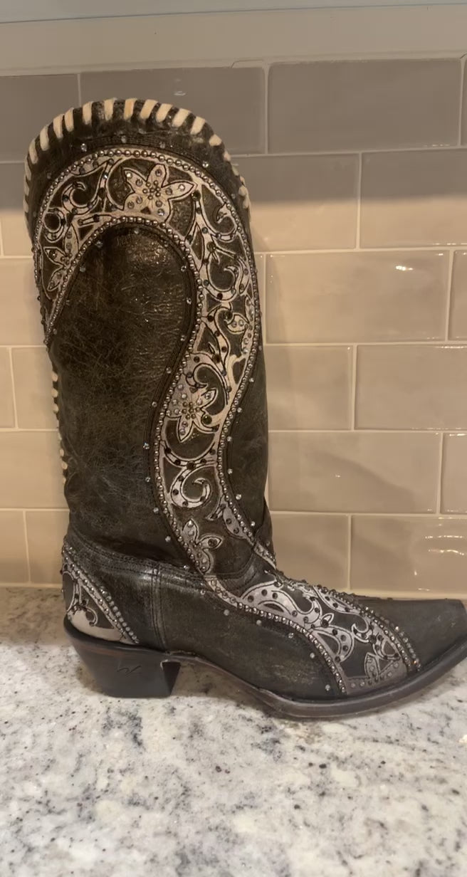 Great boots for a great price! Corral boots that fit TTS. These boots are an elegant twist on a lace like design in black, white and gray colors. Style them to any color way.