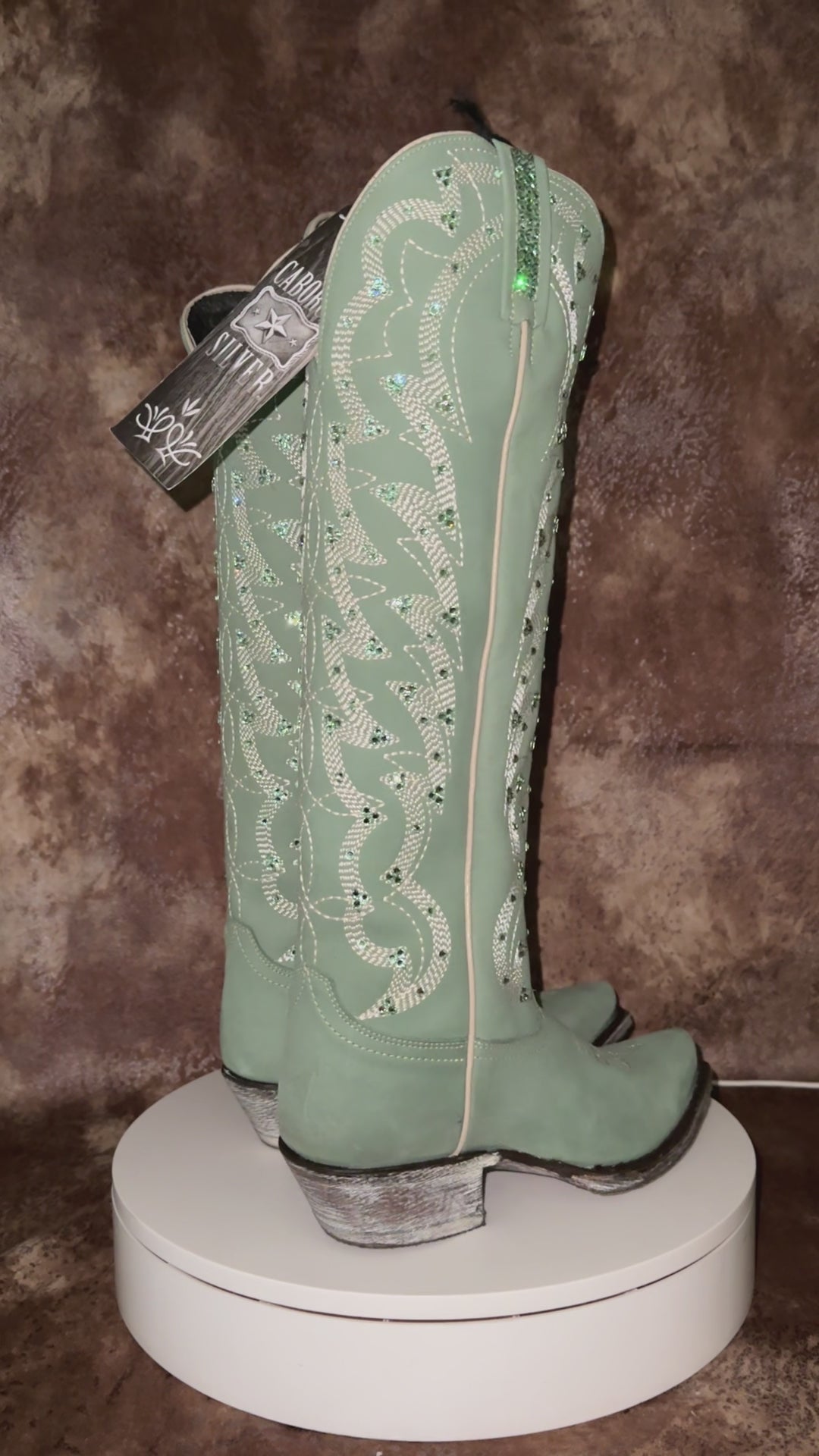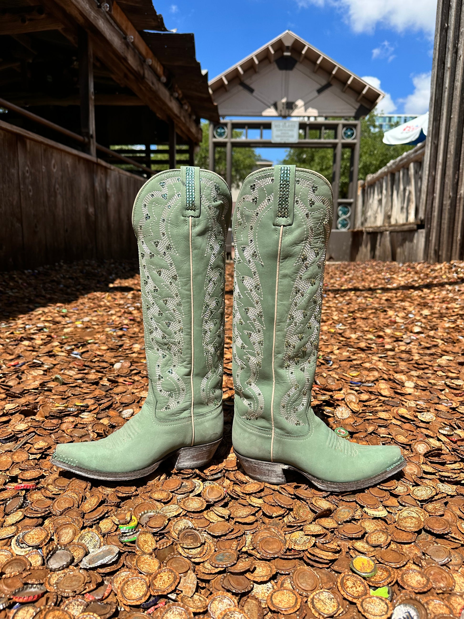These tall Liberty Black Boots are the perfect shade of sage green for this rodeo season. We all know green is hot this year! The encrusted rim really sets these boots off.