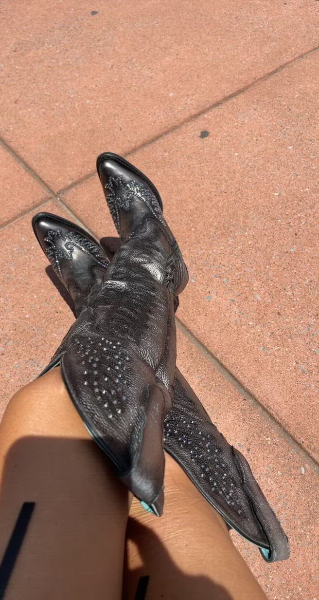 Brand: Corral. Fits TTS. These boots also have a 1/4 zipper on the inside. Split in boot just below the knee cap for comfortable fit. If you like your boots to fit like a heel, keep normal sizing.