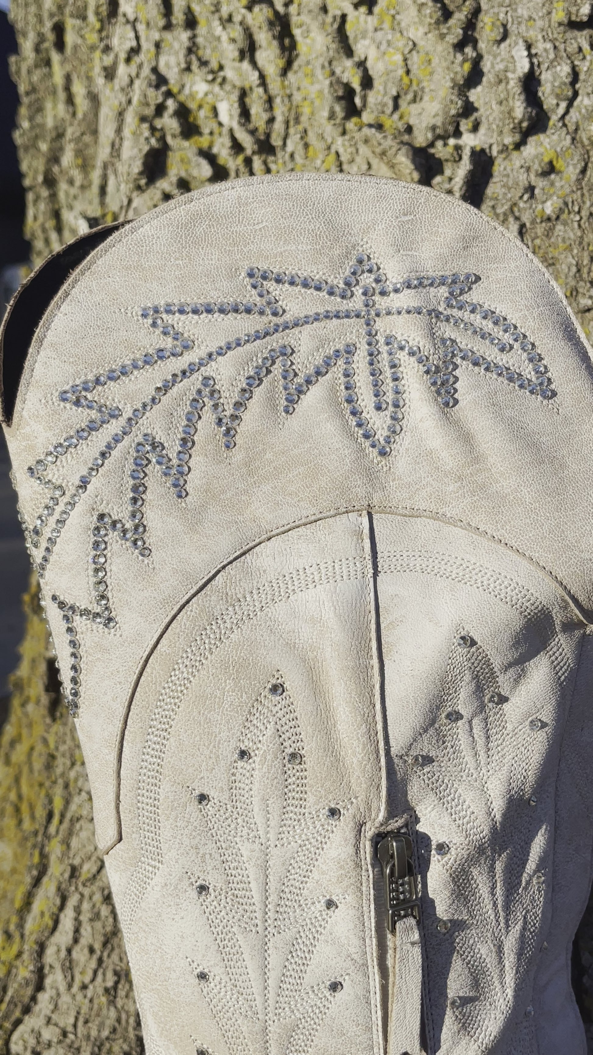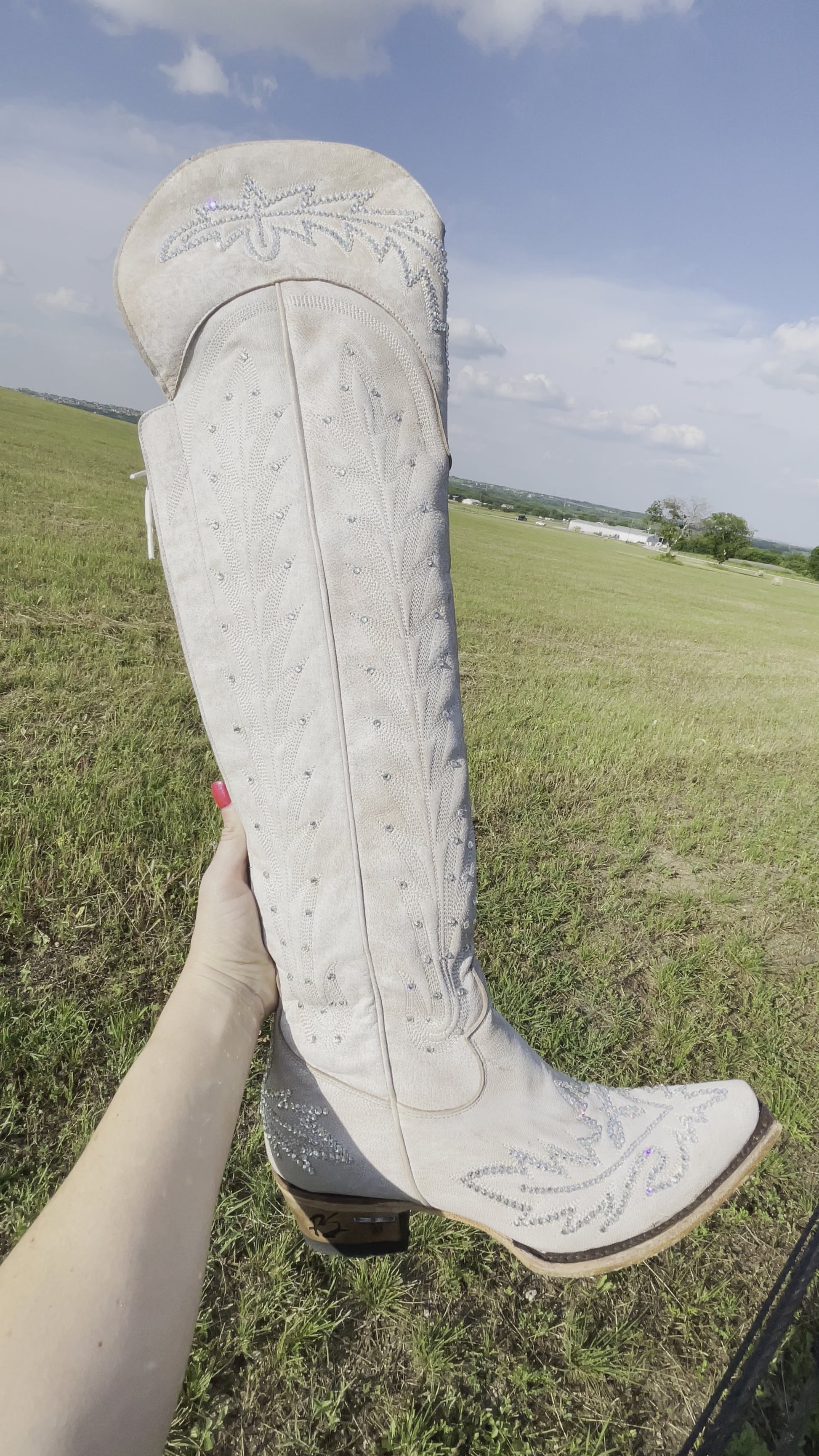 Tall white Lane Brand boots has a working corset in the back with an almost full length zipper on the inside to help accommodate those with wider calves and thighs.